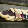 Bridon cuir avec frontal vernis et muserolle croisée élastique.