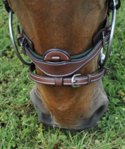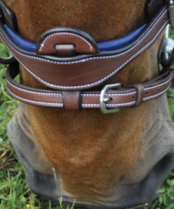 Frontal bombé carré contrasté, doublé. Muserolle combinée doublé contrasté, avec passant de muserolle amovible. Têtière anatomique, doublée, embossée cuir bleu estampé F&C. Bouclerie inox gravée F&C. Livré avec rênes caoutchouc eventer.