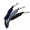 Licol nylon doublé. Muserolle, montants et têtière avec empiècements brillants et boucleries noires. Doté de 2 boucles de réglage et 1 mousqueton à ouverture rapide. Longe tressée assortie, à mousqueton noir. Bouclerie nickelée noire.